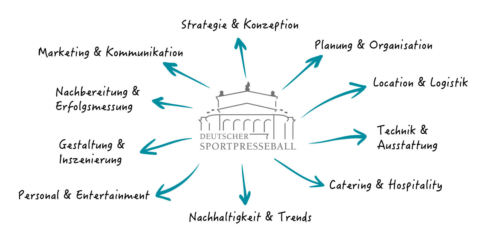 Der Deutsche SportpresseBall ist unser Meisterstück: Seit fast vier Jahrzehnten formen wir diese glanzvolle Gala zu einer renommierten Eventmarke mit nationaler Strahlkraft. Aus diesem Erfahrungsschatz entsteht ein Leistungsportfolio, das jede Facette moderner Event- und Kommunikationskunst abdeckt – von Strategie, Planung und Logistik über Technik, Hospitality und Entertainment bis hin zu Nachhaltigkeit, Gestaltung und erfolgreicher Nachbereitung.