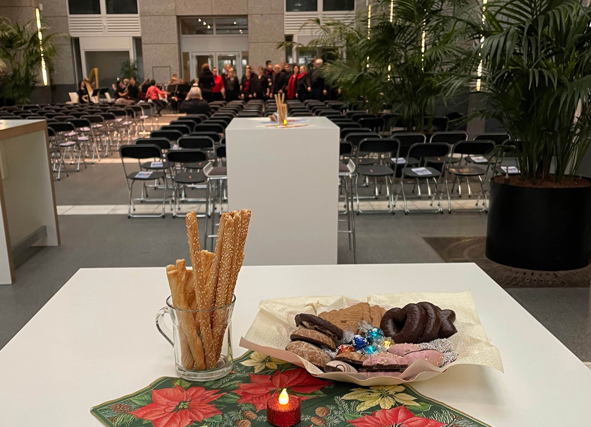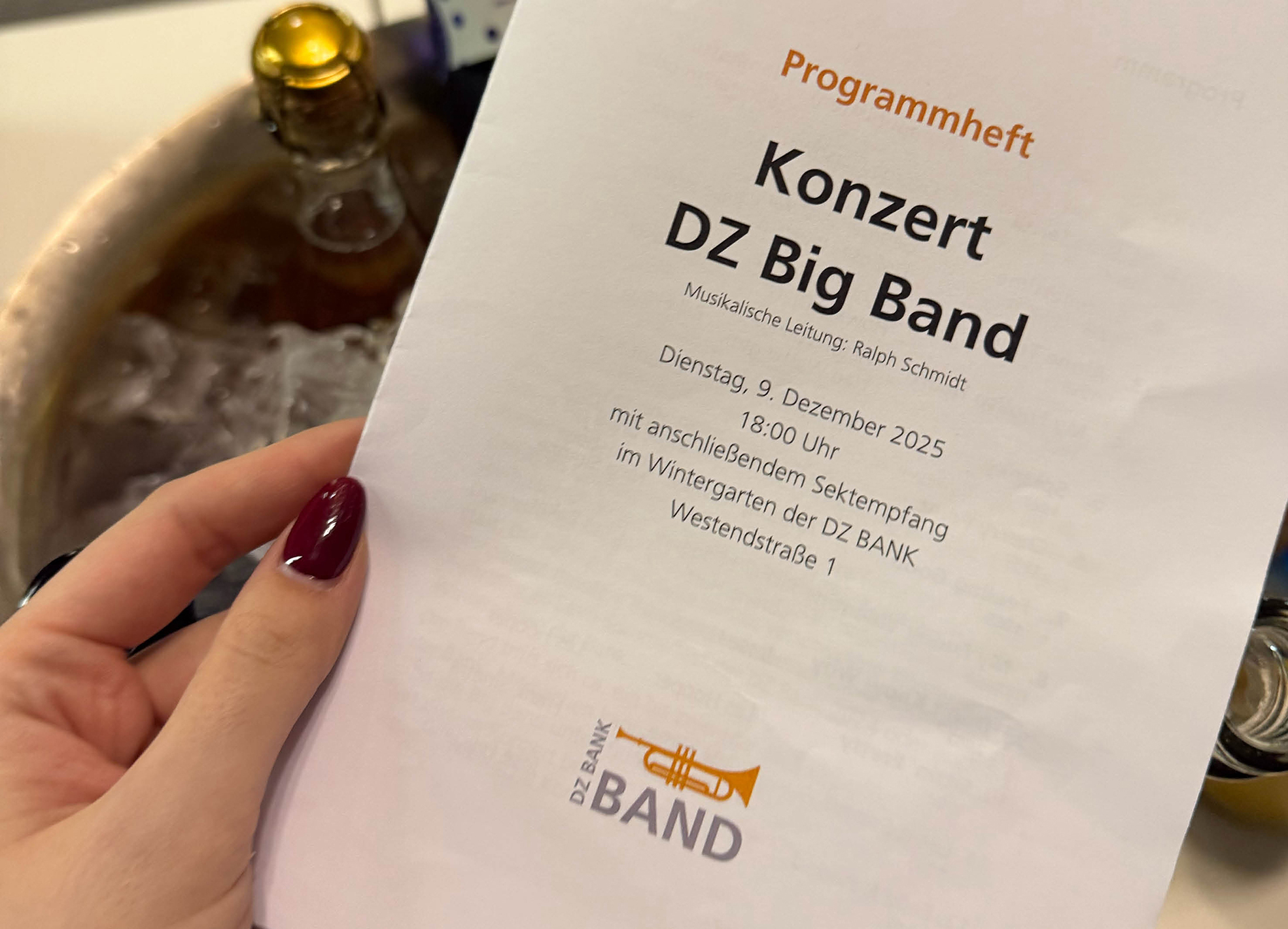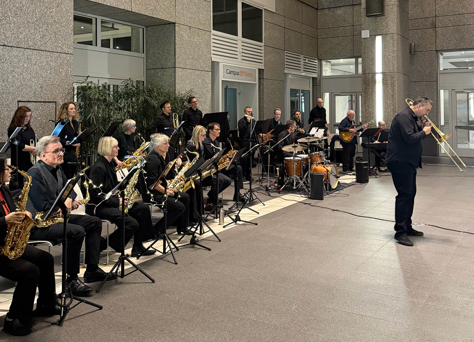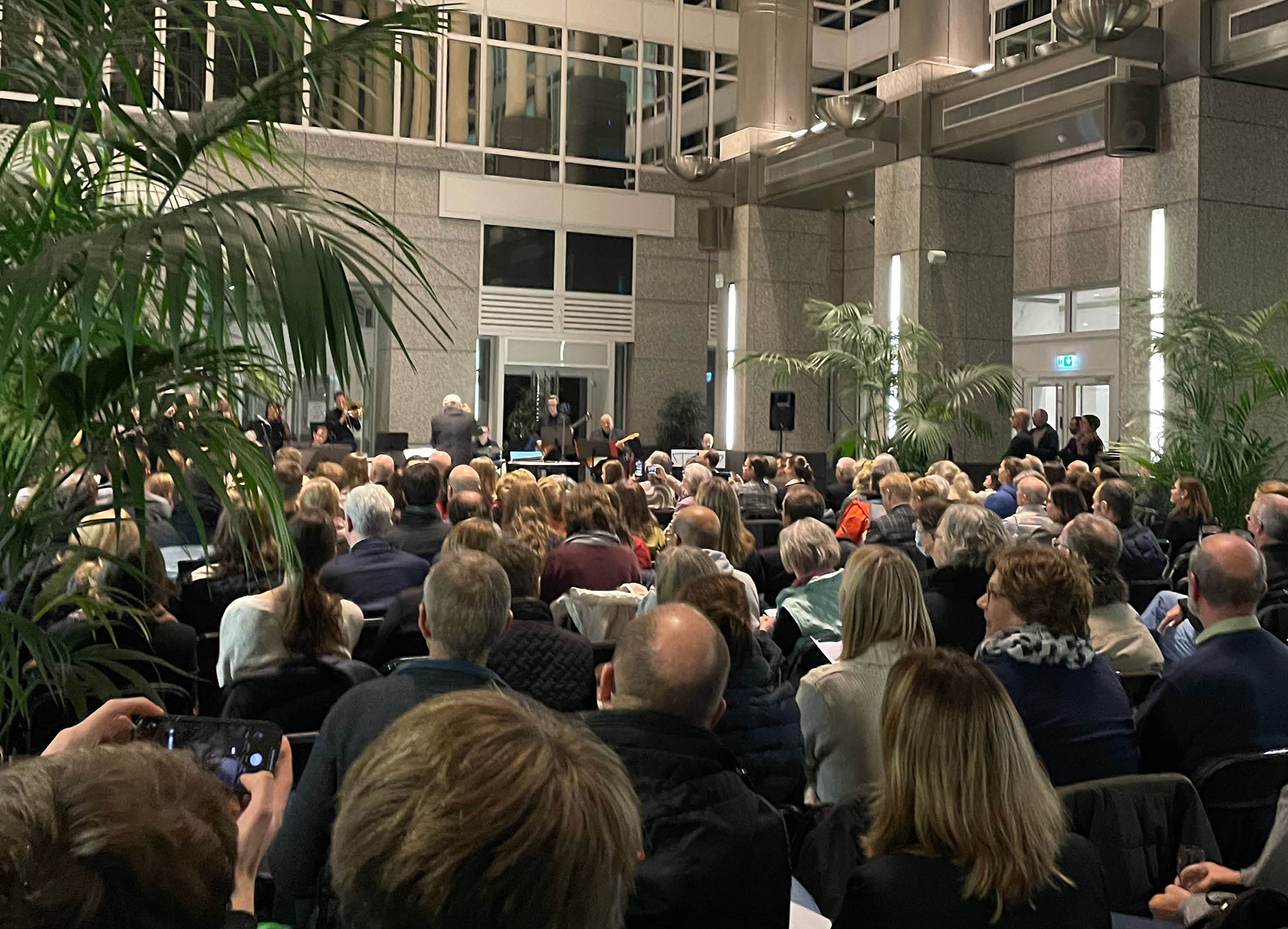Konzerte sind im Wintergarten der DZ BANK immer etwas Besonderes, insbesondere in der Vorweihnachtszeit. Umso mehr freute sich das DZ BANK Konzert unter der Leitung von Ralph Schmidt über rund 200 bestens gelaunte Gäste. Neben Mitarbeiter*innen der Bank war auch die Öffentlichkeit eingeladen, was zu einer offenen und sehr angenehmen Atmosphäre beitrug.
